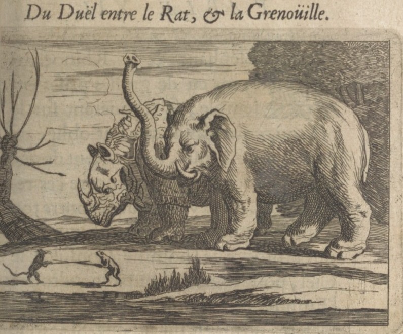 Du duel entre le Rat, et la Grenouille. Illustrated also showing a rhinoceros and an elephant. p. 138 in Audin 1648. Fables héroïques. Partie 1: Paris, J. Gaillard.