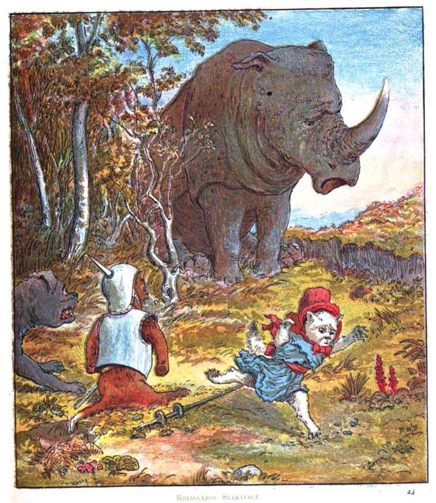 “Rhinoceros sulkyface”. Plate before p. 25 in a coloured edition of Ballantyne, R.M., 1884. The kitten pilgrims or great battles and great victories. London, James Nisbet.