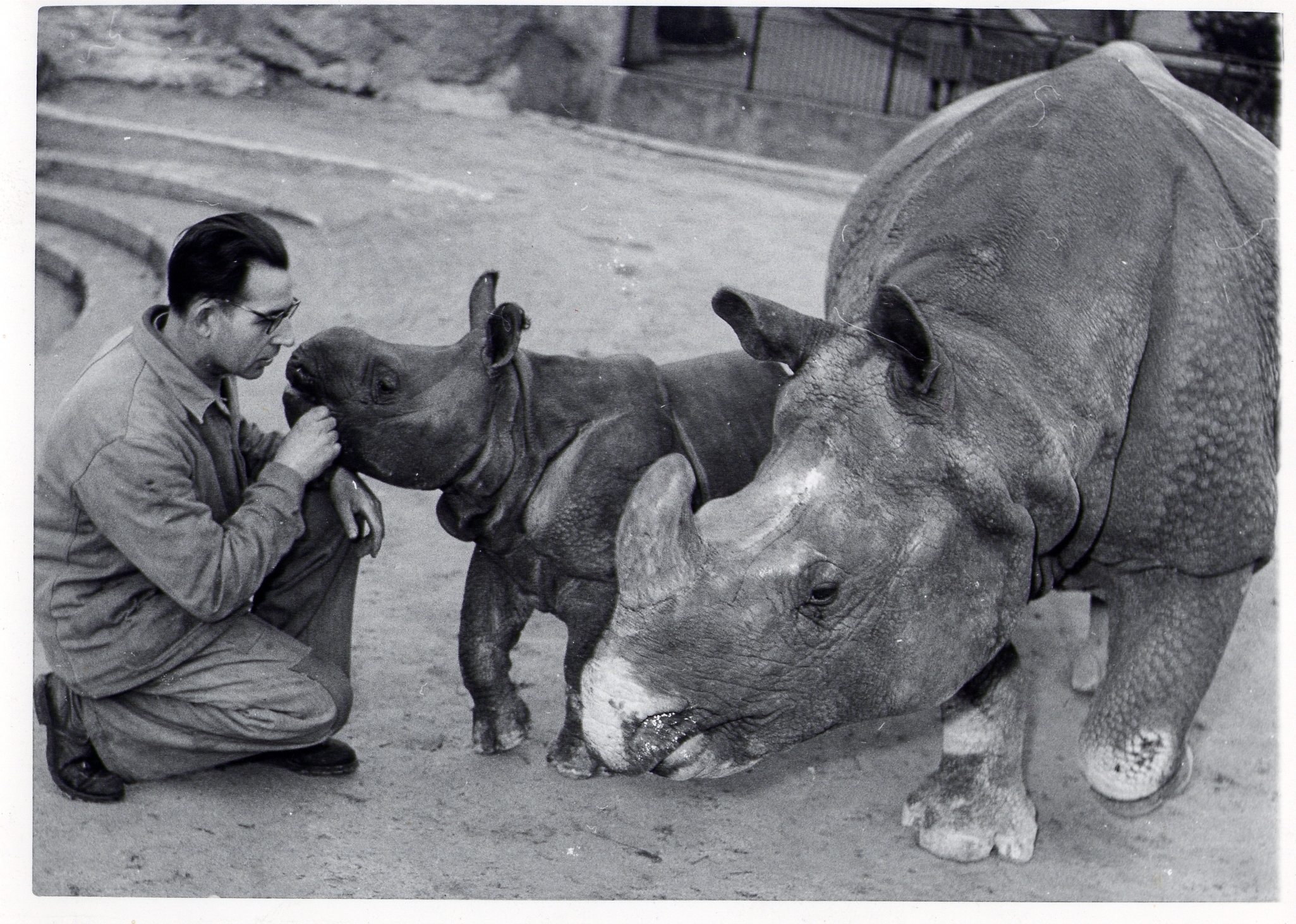Female Indian rhino ‘Joymothi’ who arived in Basel on 8 July 1952, seen with her male calf ‘Rudra’, born on 14 September 1956. Photo taken on 18 January 1957. Picture reproduced with permission of Basel Zoo.