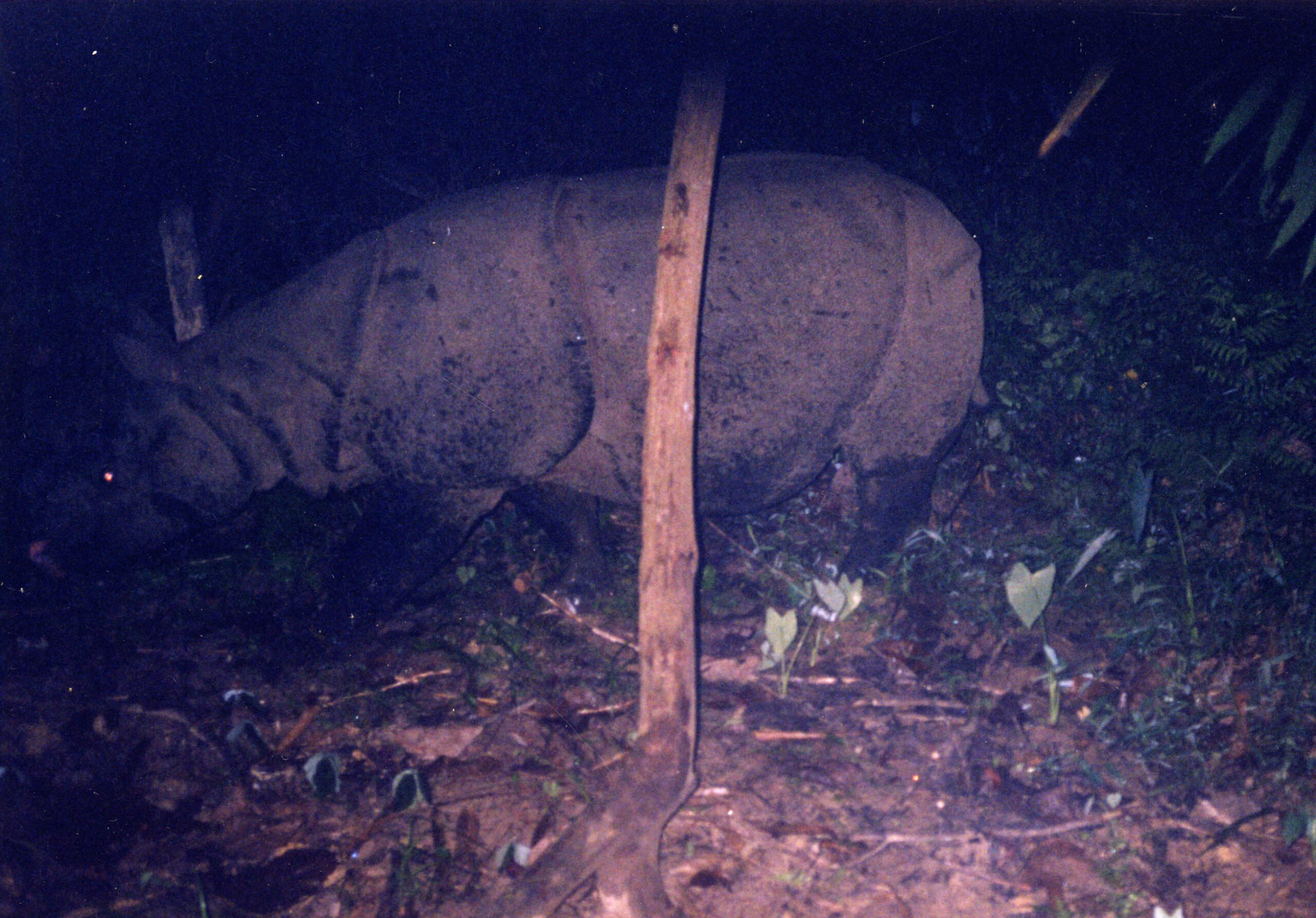 A Java Rhino caught on a camera trap. The photo was made on March the 27th, 2000 3:00 at Bau Chiem (salt lick) Phuoc Son, Cat Loc; by Phan Quoc Tuan