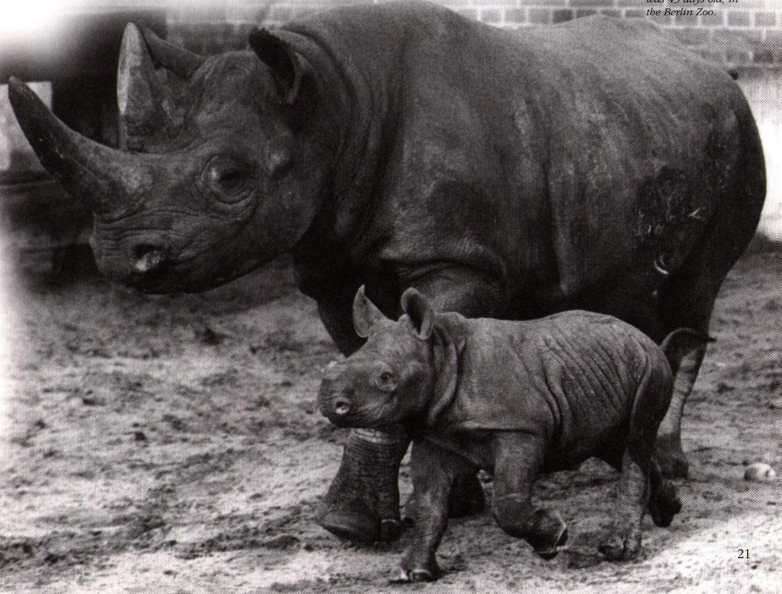 Black rhinoceros in Berlin Zoo. Mother Theluji with daughter Sita, born 12 oct 1990, when she was 45 days old.