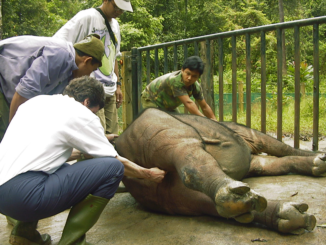 Bina, a female Sumatran Rhino, is being checked by a vet in the Sumatran Rhino Sanctuary (SRS) in Way Kambas National Park, Sumatra. Photo by Nico van Strien, 2000