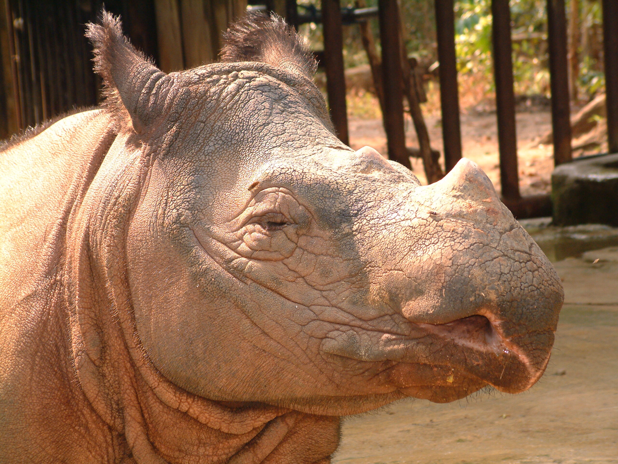 Close up of Bina, a female Sumatran Rhino at te SRS, just after she has been inspected by her keeper. The Sumatran Rhino Sanctuary (SRS) is in Way Kambas National Park, Sumatra.
