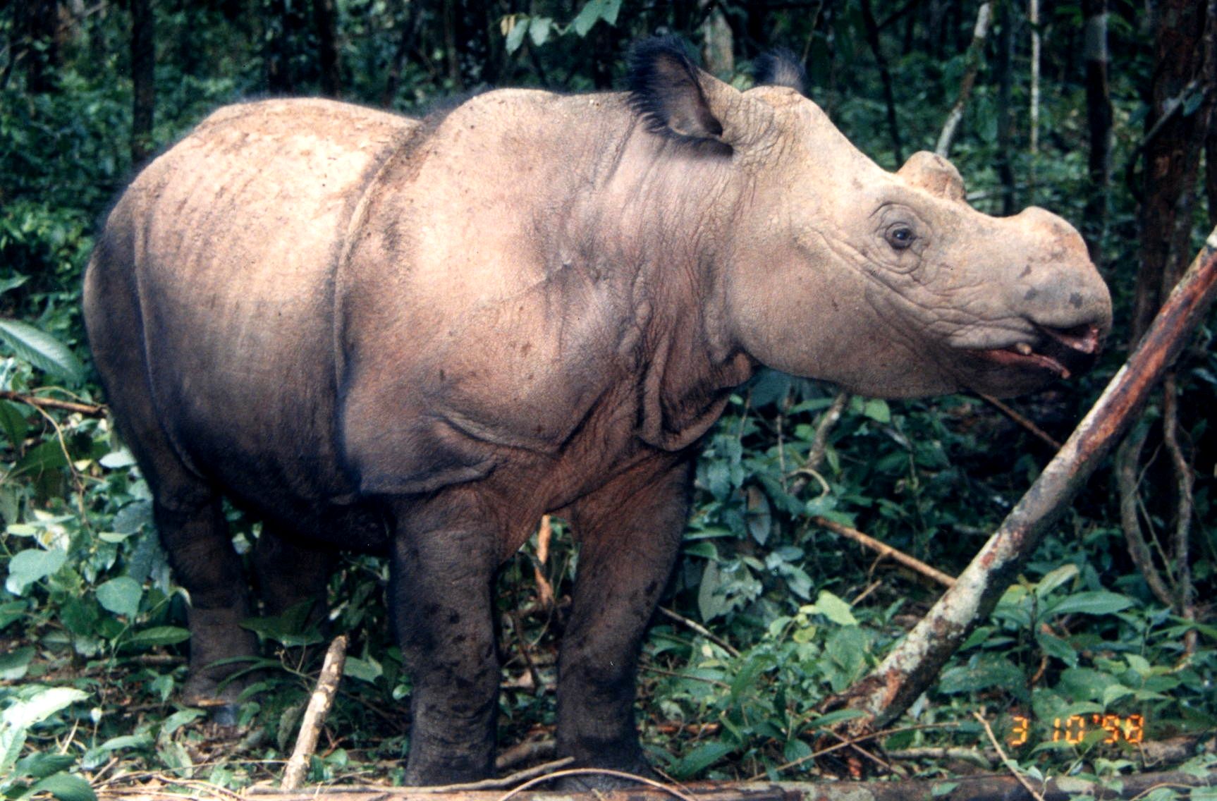 Bina, a female Sumatran Rhino, in the Sumatran Rhino Sanctuary (SRS) in Way Kambas National Park, Sumatra. Photo Nico van Strien, 1998 and Marcellus Adi