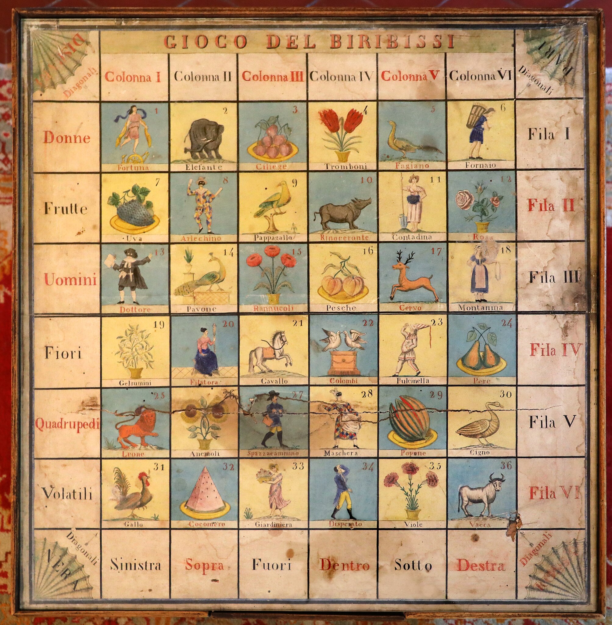 The game mentioned by Guiard as planned by the Marquis of Biribi was invented around 1750 in Genoa. It was known as Biribi (or Biribissi), or more common as Cavagnole. It was a gambling game of chance, popular for some years especially in Italy and France, played on a board of cards with various illustrations. Several examples are known where a rhinoceros is depicted on the board or on the cards. An obvious portrait of Clara is not clearly identified on the known examples.