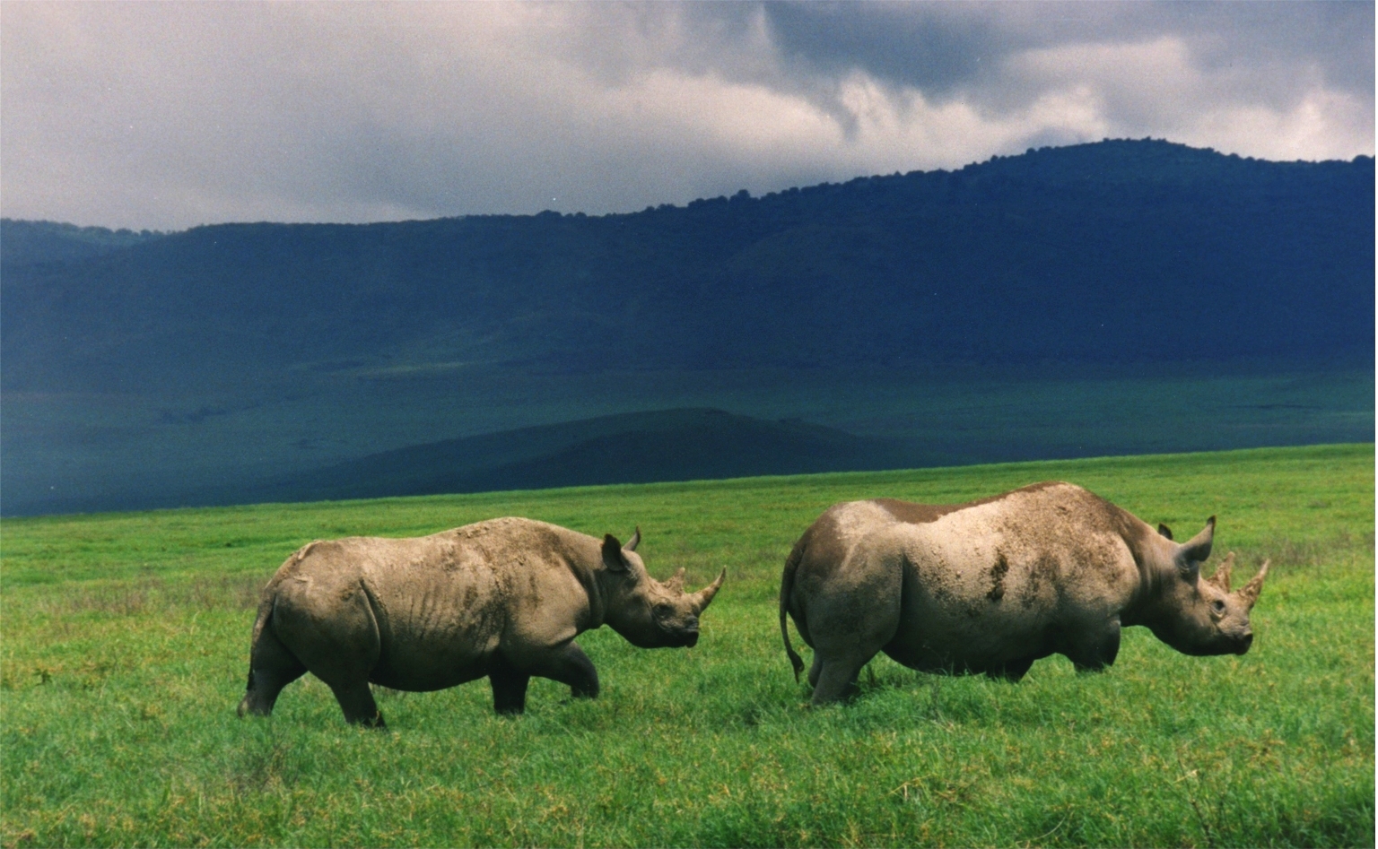 Black Rhinos Ngorongoro Black Rhinos in Ngorongoro Crater.The image is a scan of an old film print. Photograped in Ngorongoro Crater, Tanzania