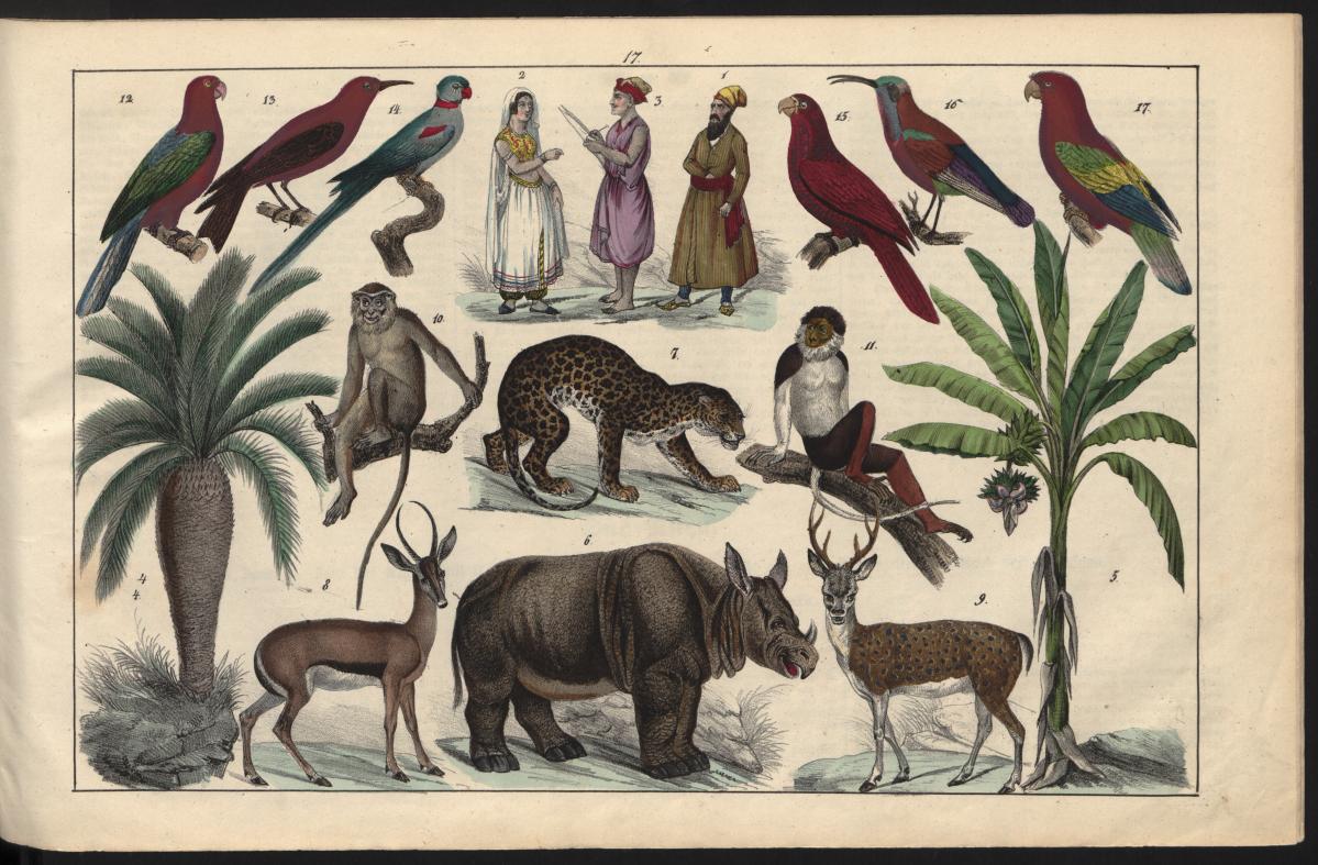 Composite plate (no. 17) of people, birds, monkeys, deer and a single-horned rhinoceros (no. 6).