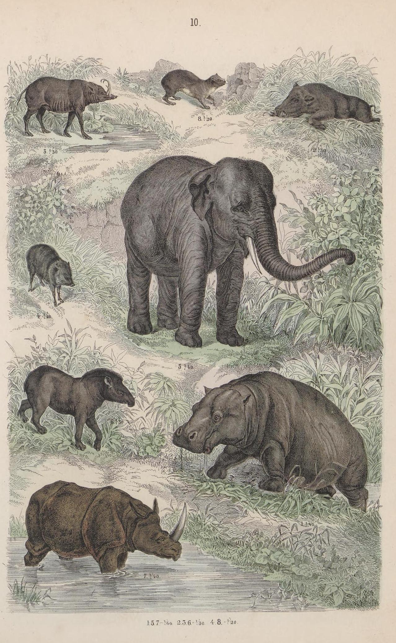 Plate 10 showing elephant, hippopotamus, tapir, pigs and a rhinoceros with one large horn. fig. 7 1/10.