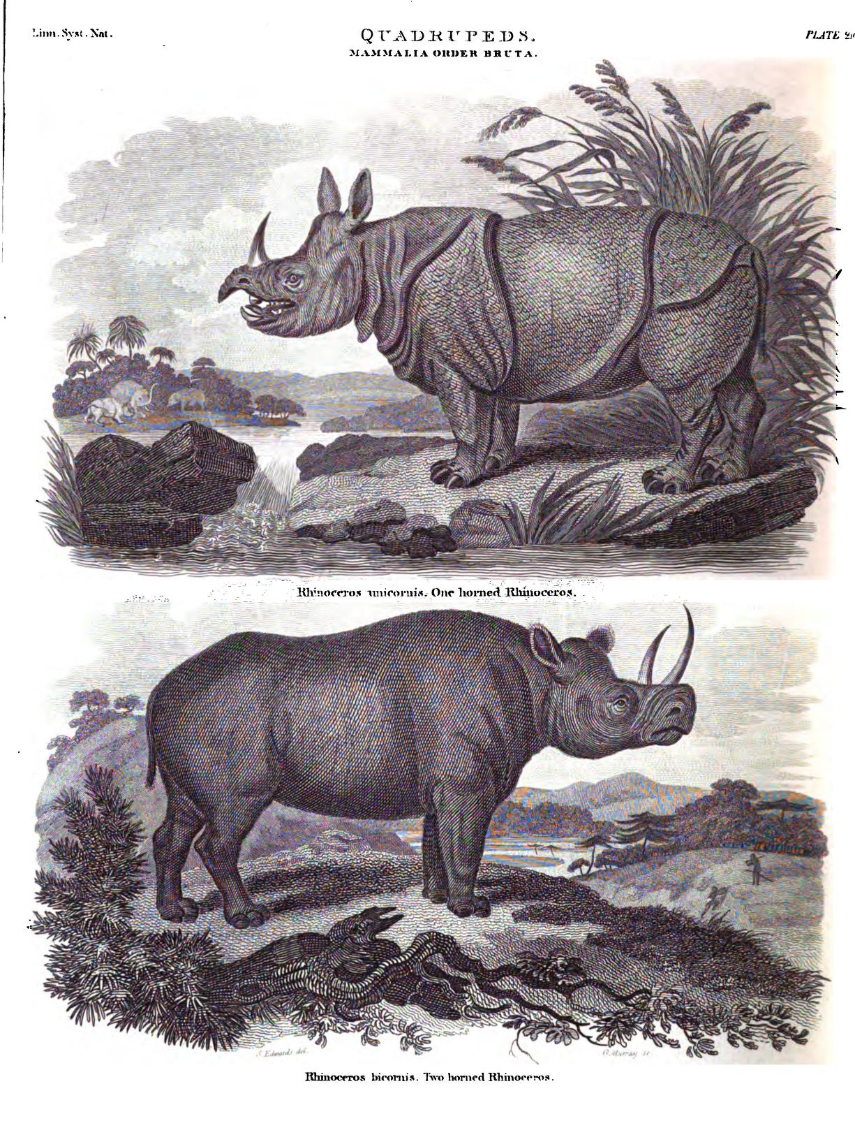 Plate CCX. Linn. Syst. Nat. – Quadrupeds. Mammalia order Bruta. Rhinoceros unicornis. One horned Rhinoceros. [and] Rhinoceros bicornis. Two horned Rhinoceros. [signed] S. Edwards del. G. Murray sc.