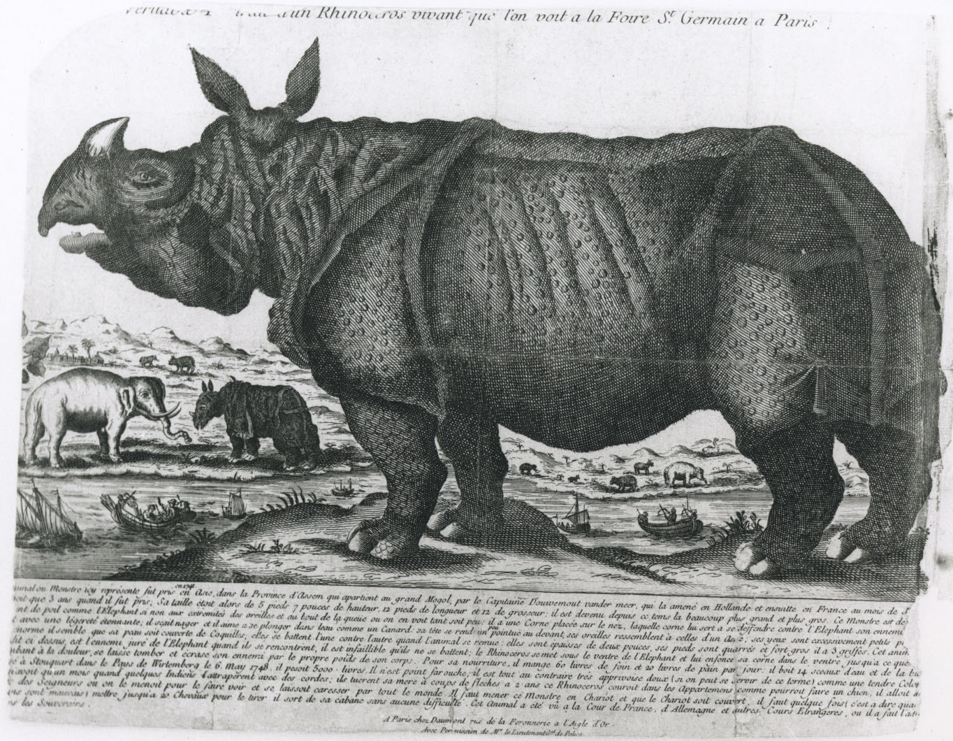 This anonymous broadsheet was commissioned by Capt. Douwe Mout to advertise the presence of Clara in Paris. It is a unique example in that the background differs from all the other broadsheets made of Clara.