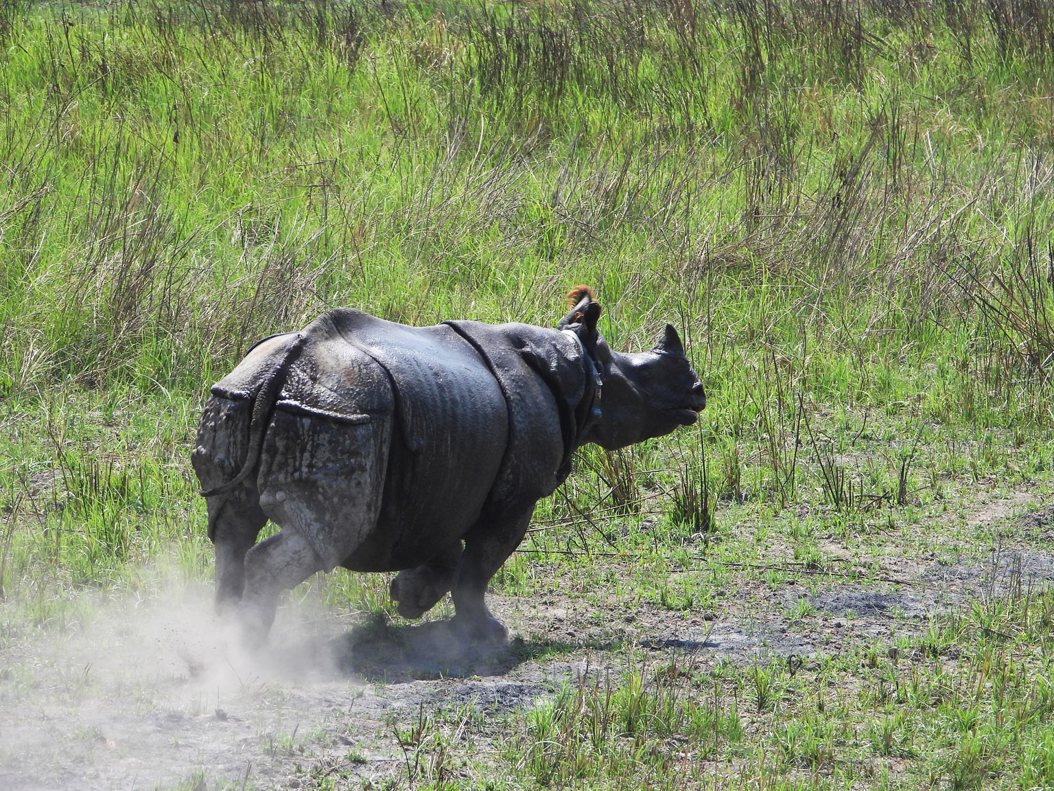 Greater one-horned rhinoceros in Dudhwa National Park. Taken just after the animal’s release ater a successful translocation, on 5 April 2025. Photo by Vipin Kapoor, WWF India.