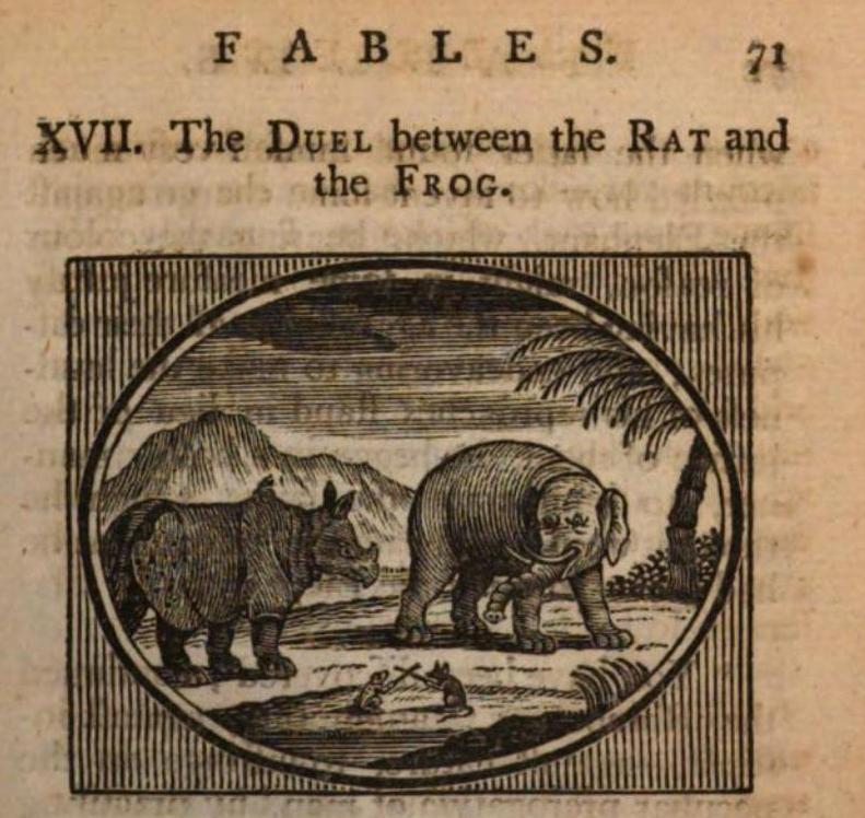 Rhinoceros and elephant, in fable about the duel between the rat and the frog. Page 71 in Payn, J. 1787. Fables calculated for the amusement and instruction of youth; originally dedicated to a young prince, for whose improvement they were written. Taunton, Printed and sold for the Translator, by J. Poole.