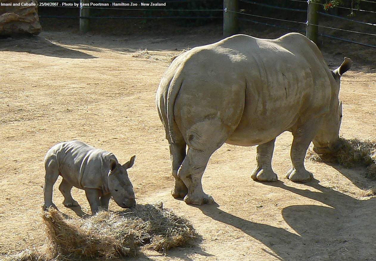 White rhinoceros in Hamilton Zoo, New Zealand. This is female Caballe (arrived from Kruger National Park in 1999) with her third child, female Imani born on 26 March 2007. Photo copyright by C.J.F. Poortman, 25 April 2007.