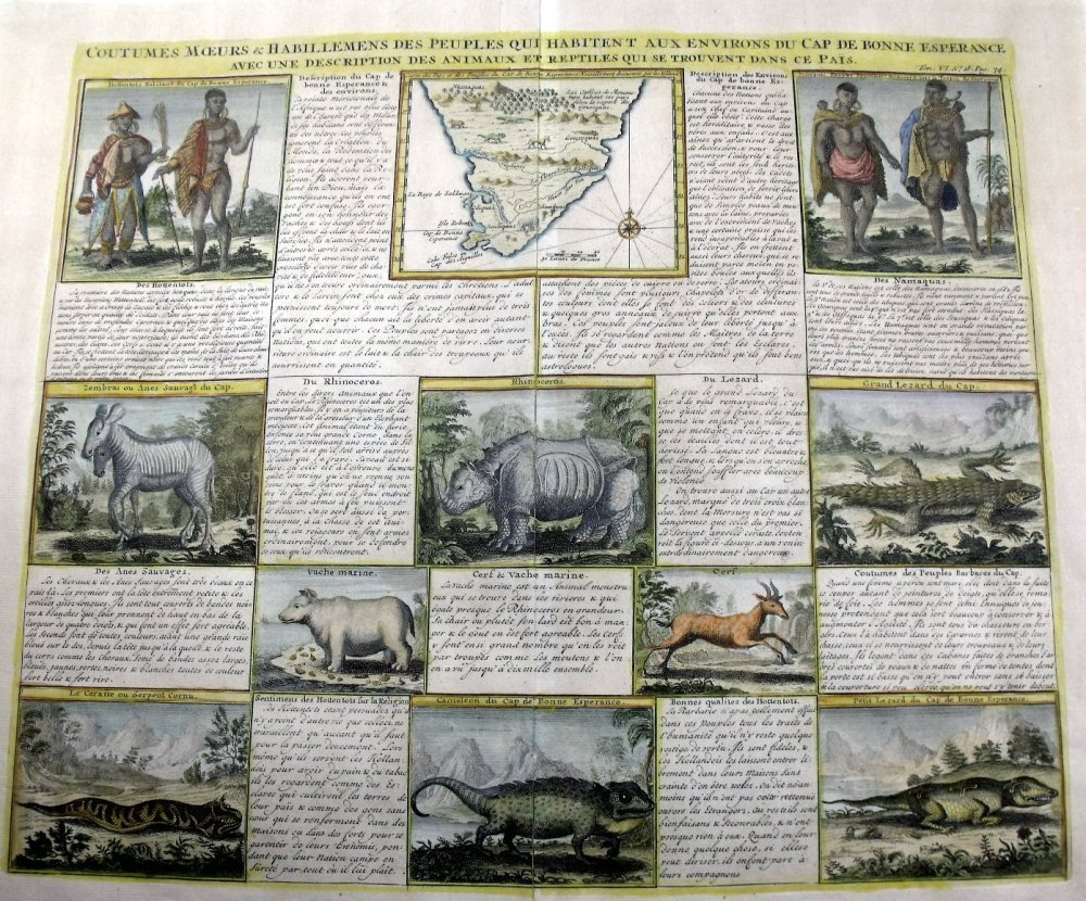 Map with 10 engravings and descriptions, entitled “Carte des Pays et des Peuples de Bonne Esperance. Nouvellement decouverts par les Hollands.” From Henri Abraham Chatelain, Coutumes, Moeurs et Habillemens des Peuples qui Habitent aux Environs du Cap de Bonne Esperance avec une Description des Animaux et Reptiles qui se trouvent dans ce Pays. Amsterdam, Gueudeville, 1719