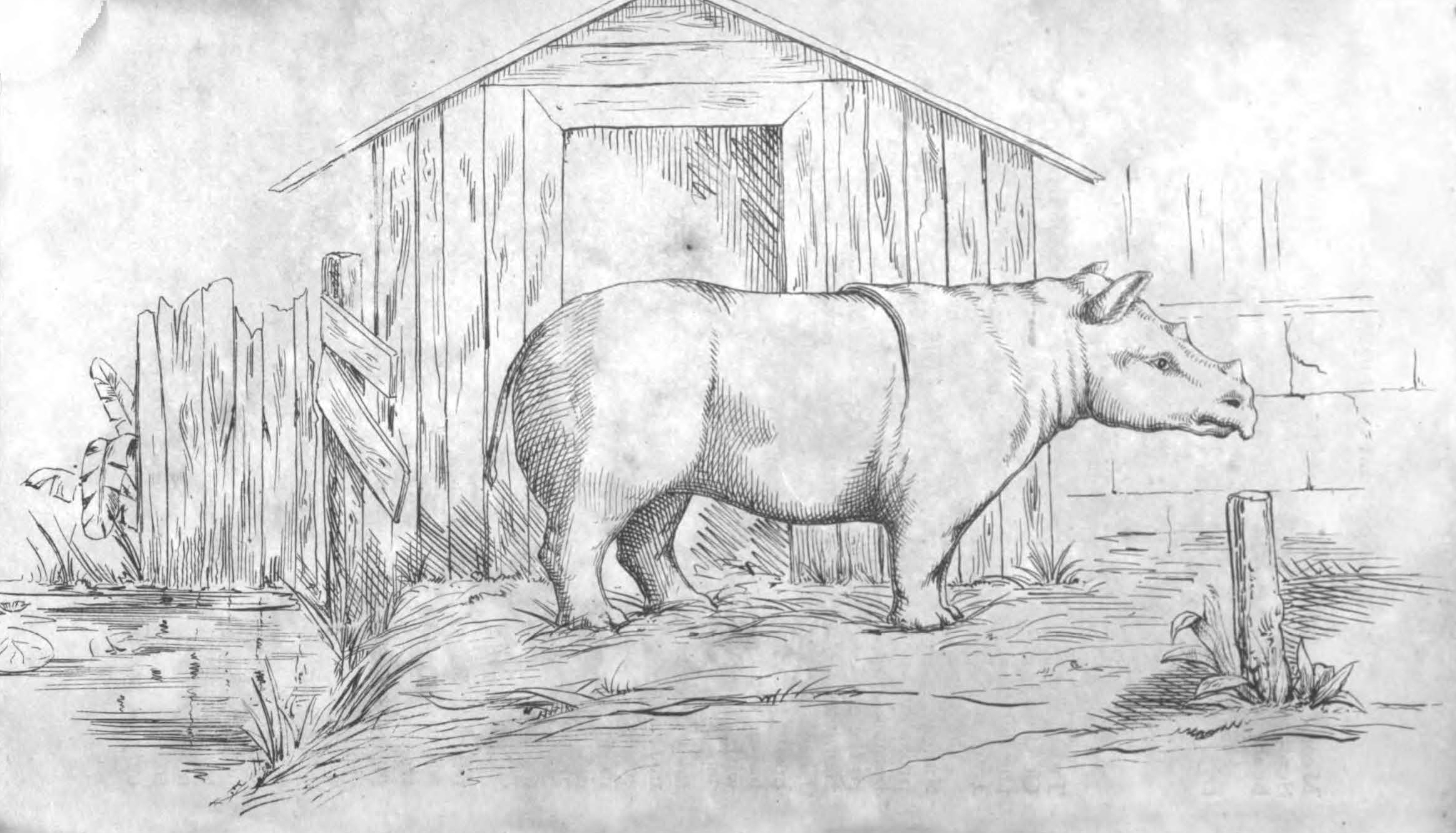 Drawing of the two-horned rhinoceros Begum when she was in Chittagong in 1867 or 1868, drawn by Captain Frederick Henry Hood (1837-1875). (Oriental Sporting Magazine, March 1869)