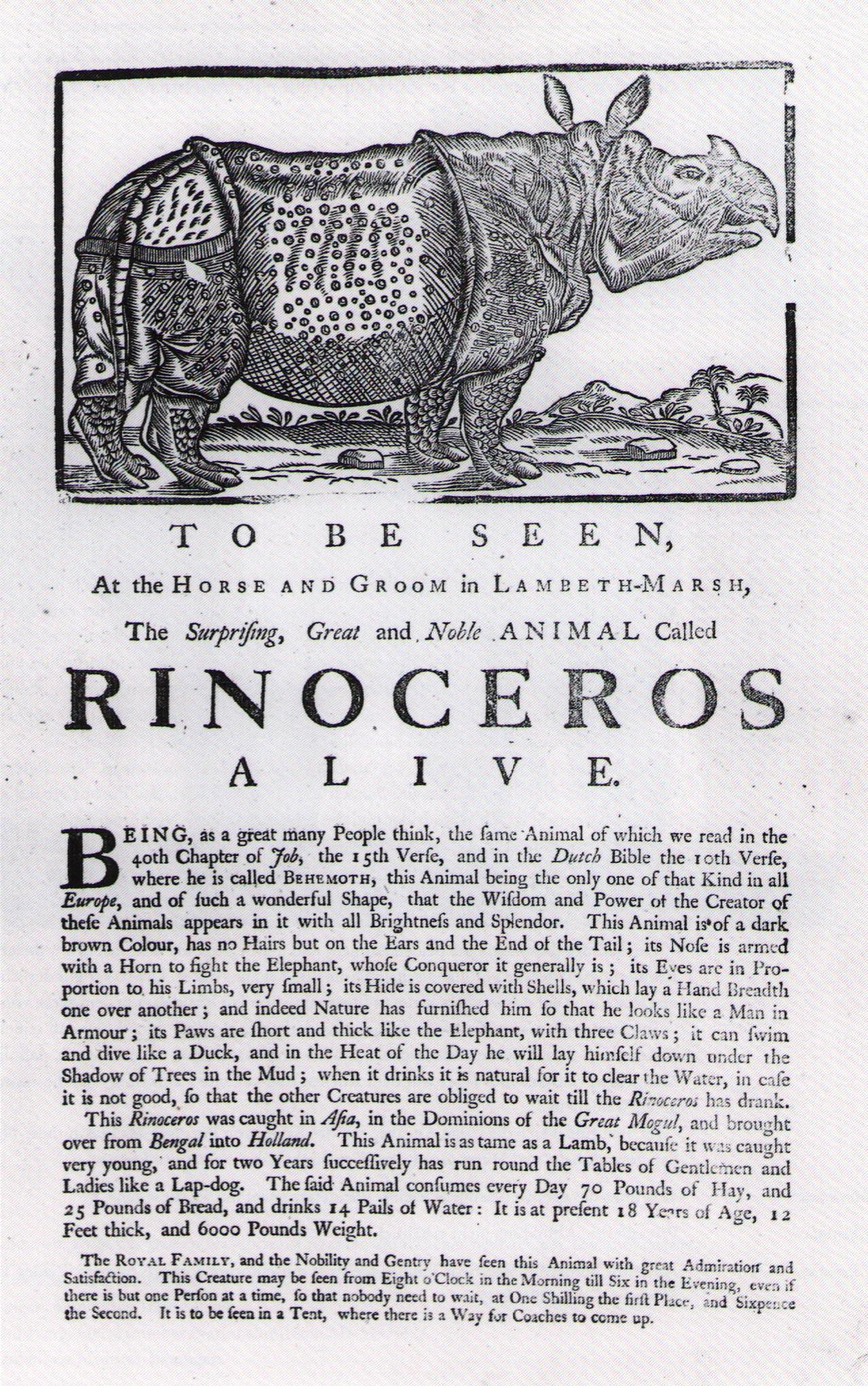Woodcut advertising the exhibition of a rhinoceros in London, undated, but probably 1756.