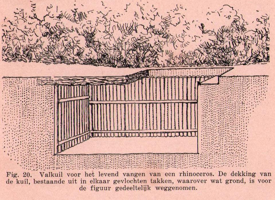 Pit trap made to catch a rhinoceros alive. The top is made of branches covered by soil, which is partly removed in the illustration. This is an artist’s impression based on the narrative of the capture of a Javan Rhinoceros in the Dindigs, Malaysia in 1905 by O’Hara. The drawing was made for, and first published, in the 1941 book by H.J.V. Sody, p. 138, fig. 20.