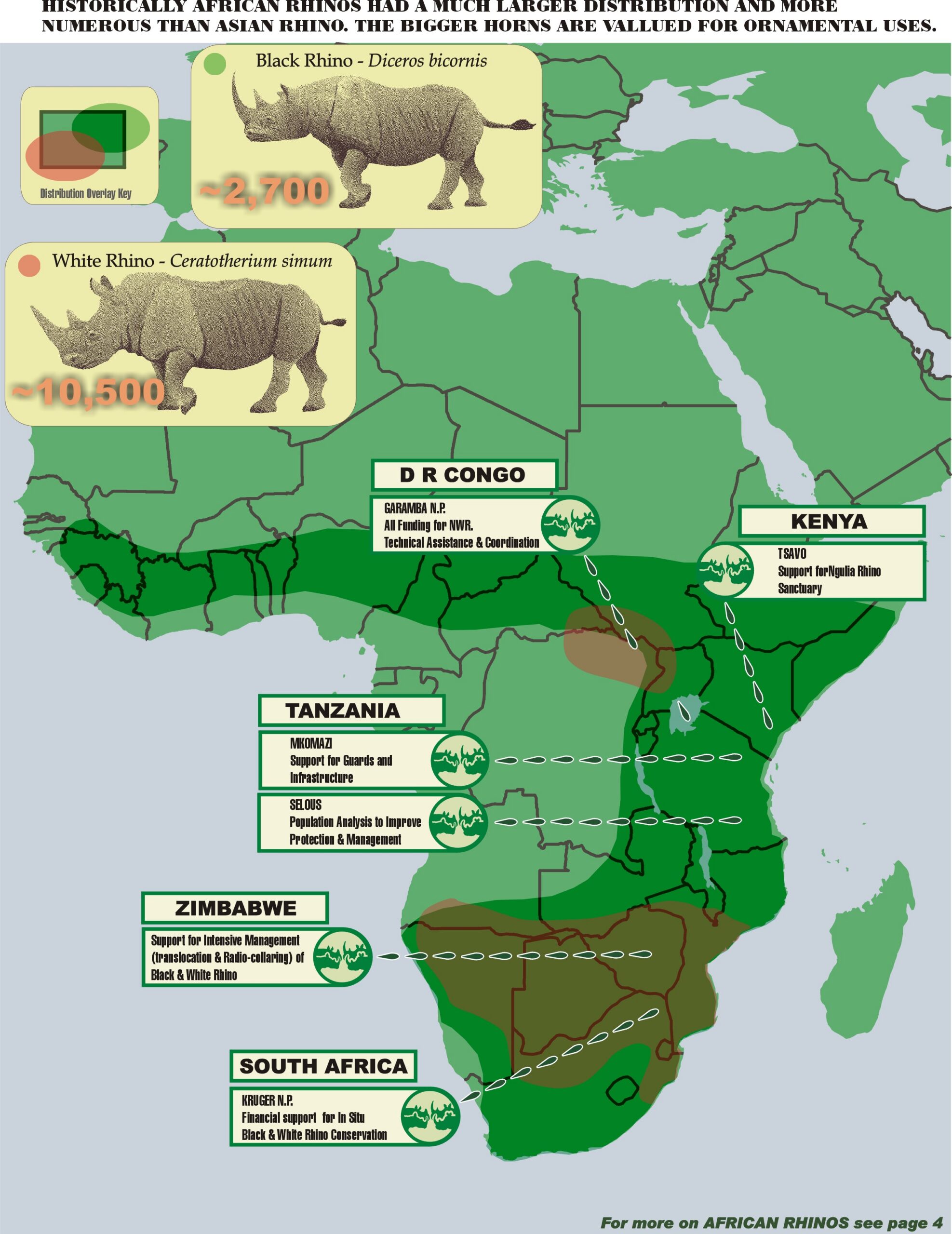 International Rhino Foundation has programs in several Rhino Range States in Africa, focussing on critically endangered populations. Map by Nico van Strien, 2003