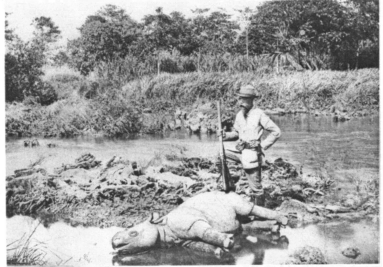 Photo taken in Ujung Kulon (Southwest Banten, Java, Indonesia) in 1895. It shows the Eurasian hunter Charles te Mechelen with a young Javan rhino. From Nederlandsch Indie Oud & Nieuw, vol. 2 (1918), p.308.