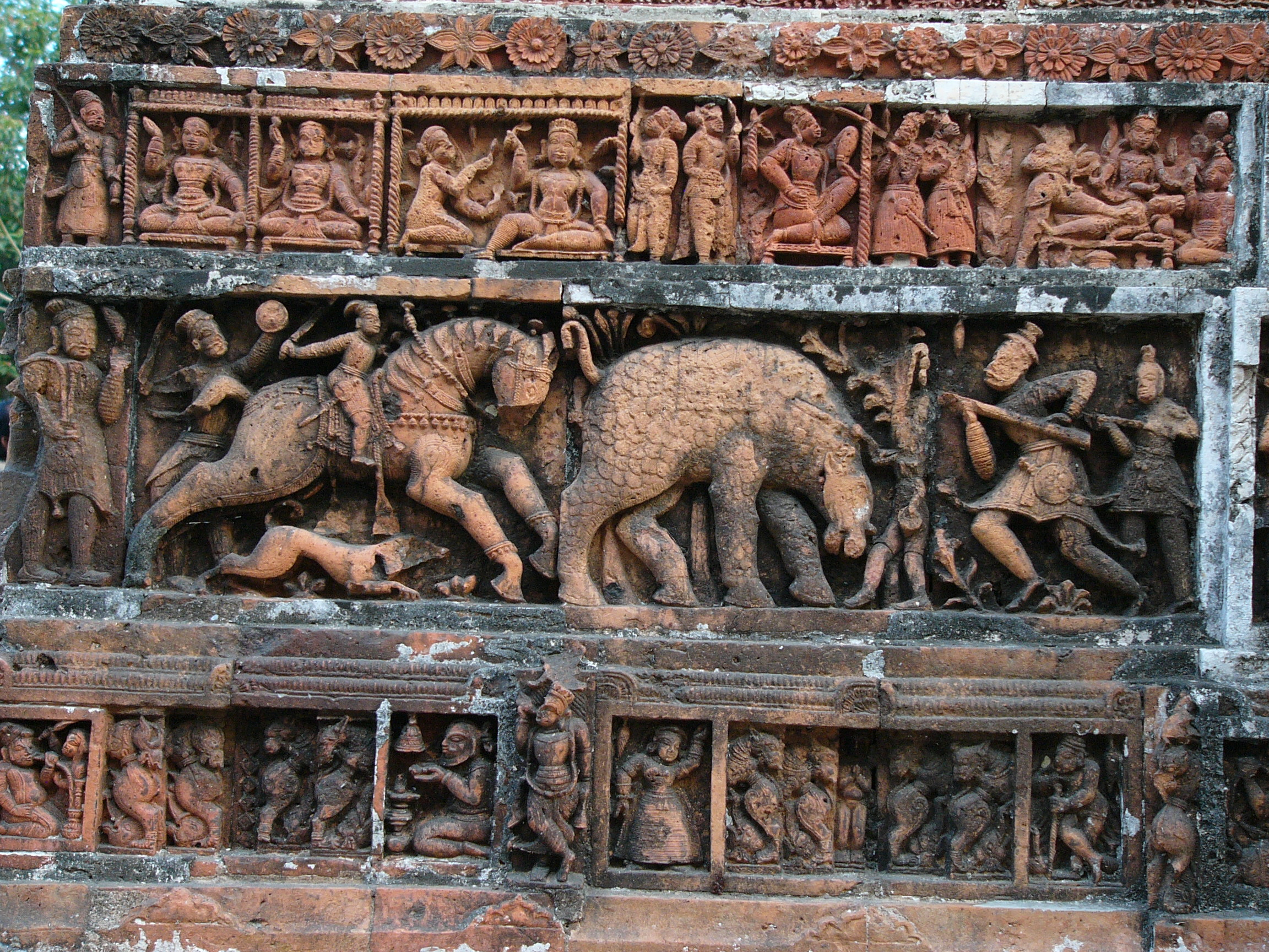 Rhinoceros hunted by a rider on horseback as well as two persons with guns, in a plaque of the Kantaji Temple in Kantanagar, Bangladesh (Photo Joachim K. Bautze)