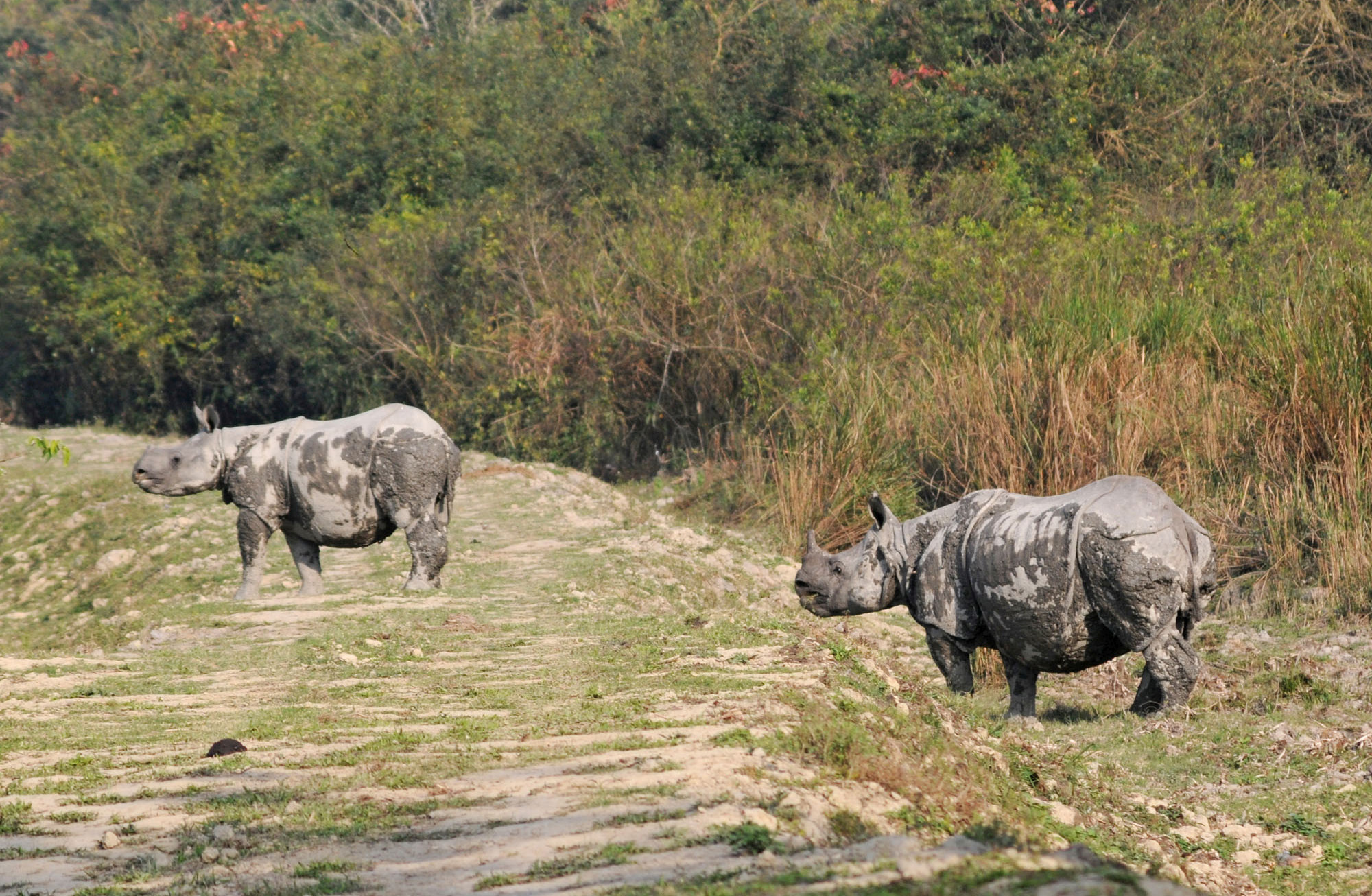 Indian Rhino (Rhinoceros unicornis) female with calf at Kaziranga National Park, Assam, India, on 2008-02-29. Photo taken by Jürg Völlm †, Basel.