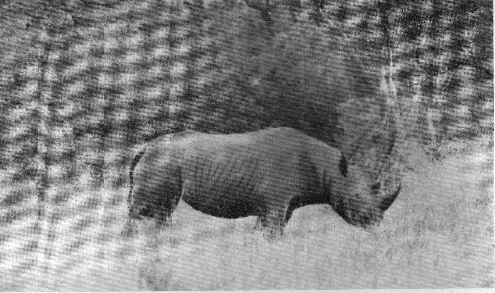 Black rhinoceros grazing. Picture taken after drought and every rib showing. From C.H. Stockley, 1948. African camera hunts, pl. 15.