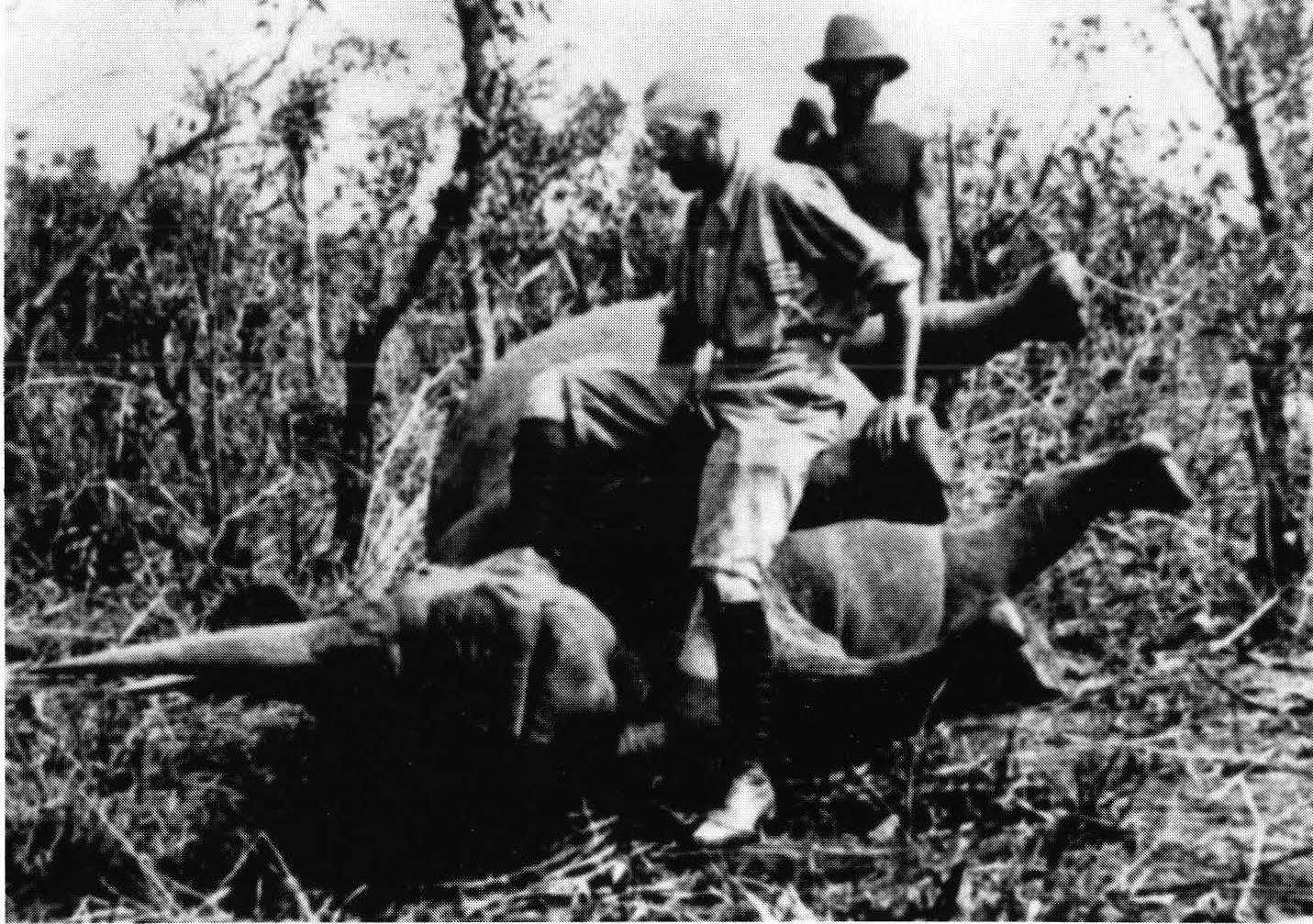 Lebrun and his hunter Bala on a white rhinoceros shot in Uele, Congo in 1912-1913