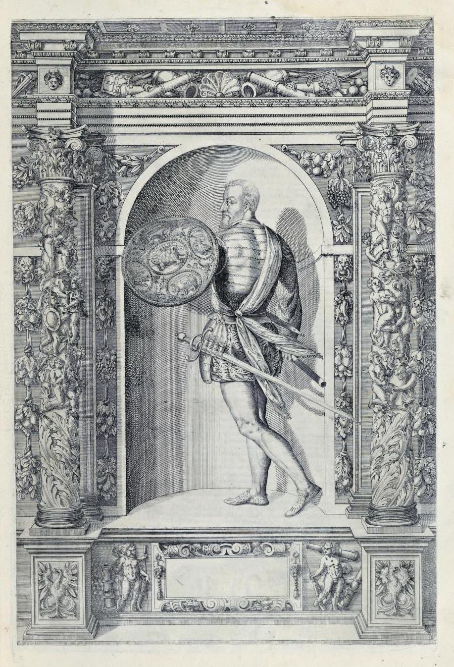 Jacob Schrenck von Nozing (Notzing, died 1612) was the secretary of Archduke Ferdinand, who compiled this catalogue of the Archduke’s collecton of armour. One of the plates ilustrates a leather shield or roundel of Gian Giacomo de’ Medici, then kept in Archduke Ferdinand’s Schloss Ambras. The shield was transferred to Vienna in 1806 and is now preserved Imperial Armouries, Kunsthistorisches Museum, Vienna. The illustrations are attributed to Dominic de Coster.