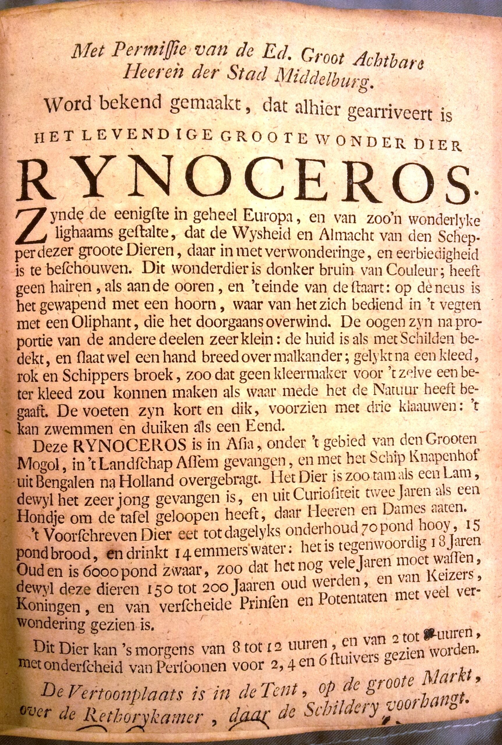 Word bekend gemaakt, dat alhier gearriveert is Het levendige groote wonder dier RYNOCEROS.