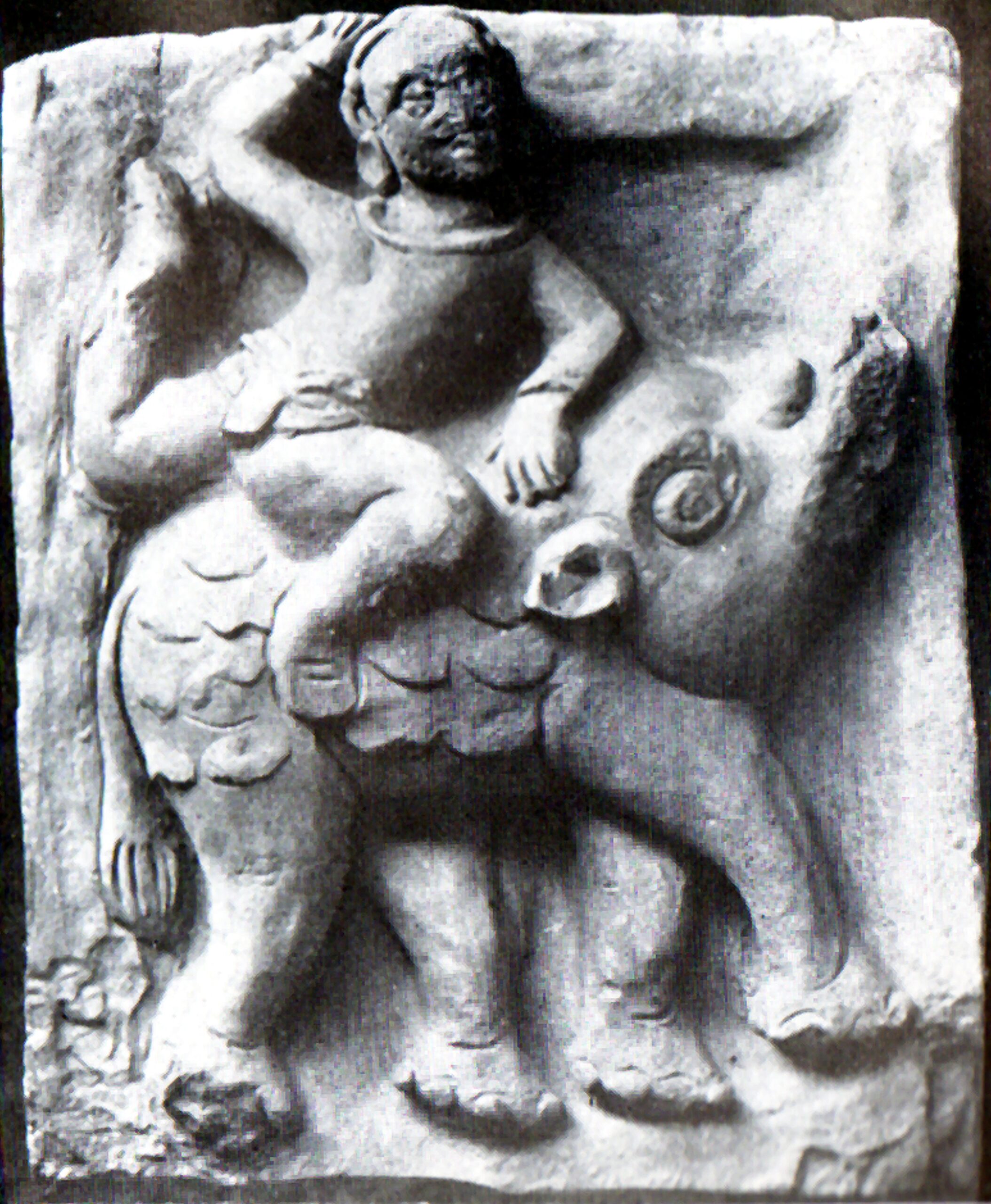 Rhinoceros with rider on a 9th century terracotta plaque found at Paharpur, Rajshahi Division, India.