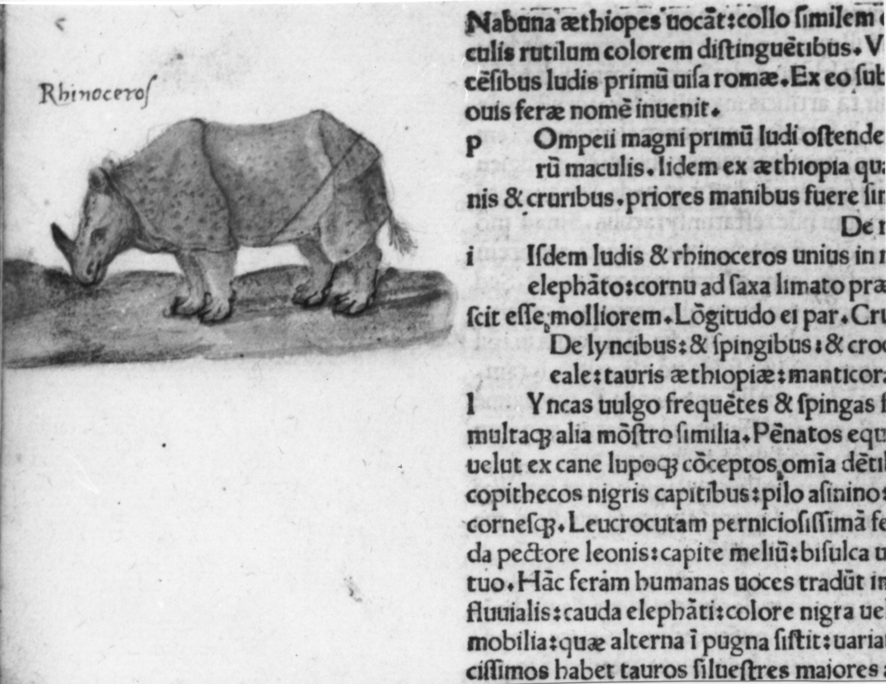 Rhinoceros painted in the margin of a page of a 1481 edition of the Historia Naturalis by Pliny, which was added in the period 1515 to 1526. (Biblioteca Palatina di Parma, Inc.Pal. 1158).