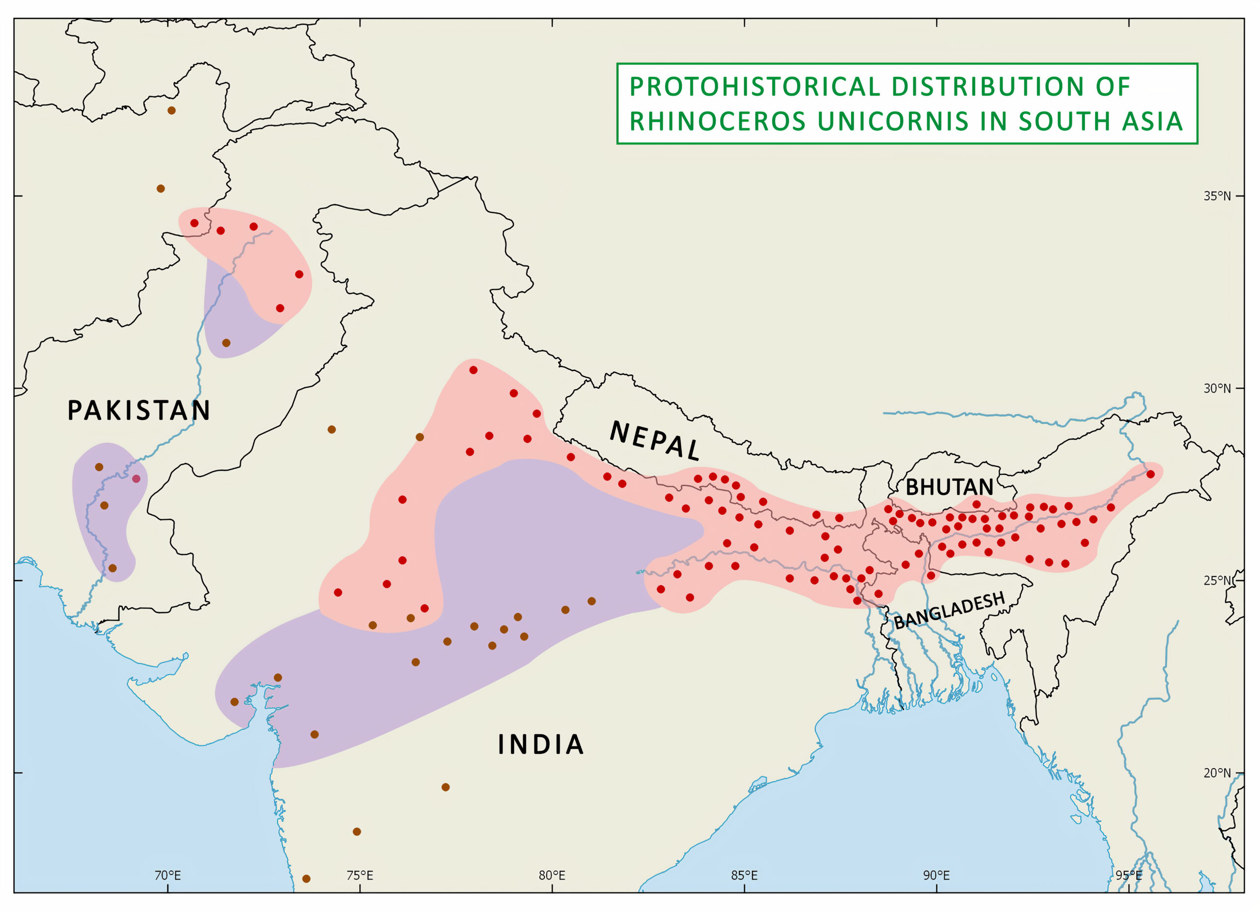 Map published in Rookmaaker, L.C., 2024. The rhinoceros of South Asia. Leiden, Brill, p. 715, map. 65.35. https://doi.org/10.1163/9789004691544_066.