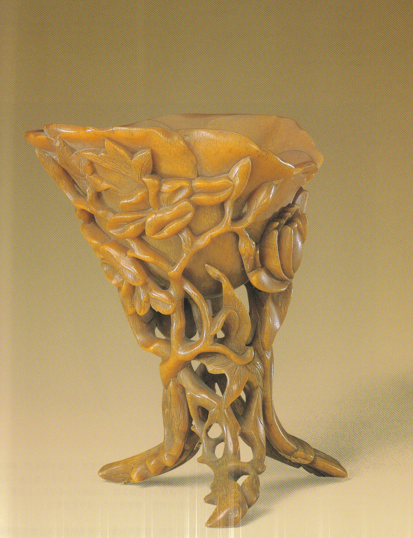 Rhino horn cup Cup with three feet and floral design. Rhino horn carving in the Palace Museum, Beijing. Early Ming Dynasty. Height 16.7 cm