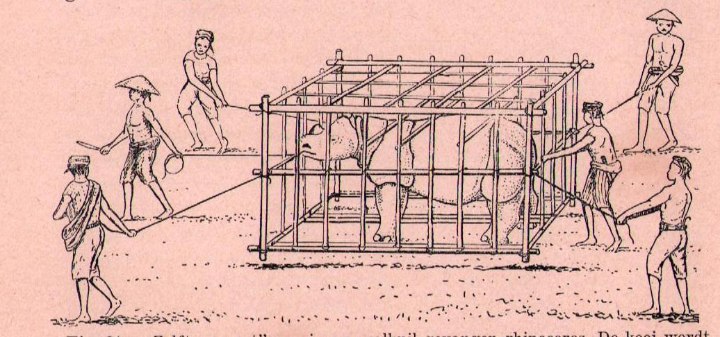 This is an artist’s impression based on the narrative of the capture of a Javan Rhinoceros in the Dindigs, Malaysia in 1905 by O’Hara. The drawing was made for, and first published, in the 1941 book by H.J.V. Sody, p. 138, fig. 20.