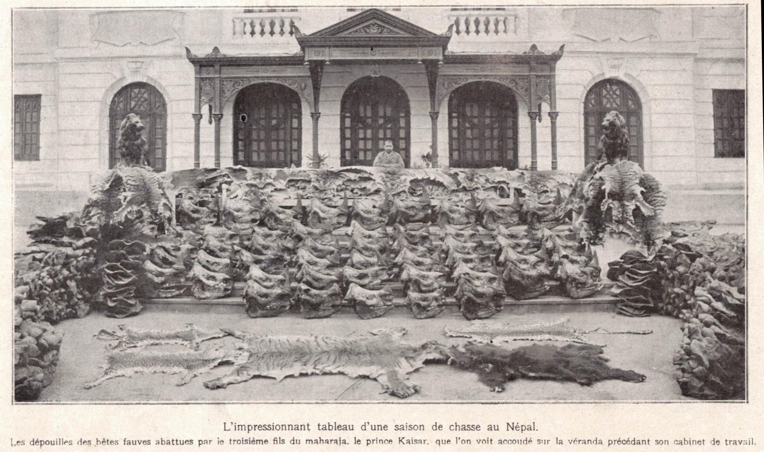 Unattributed photograph showing a large set of rhino heads on the steps of a palace in Kathmandu by Kaiser Shumsher. L’Illustration, 17 January 1925, p.59
