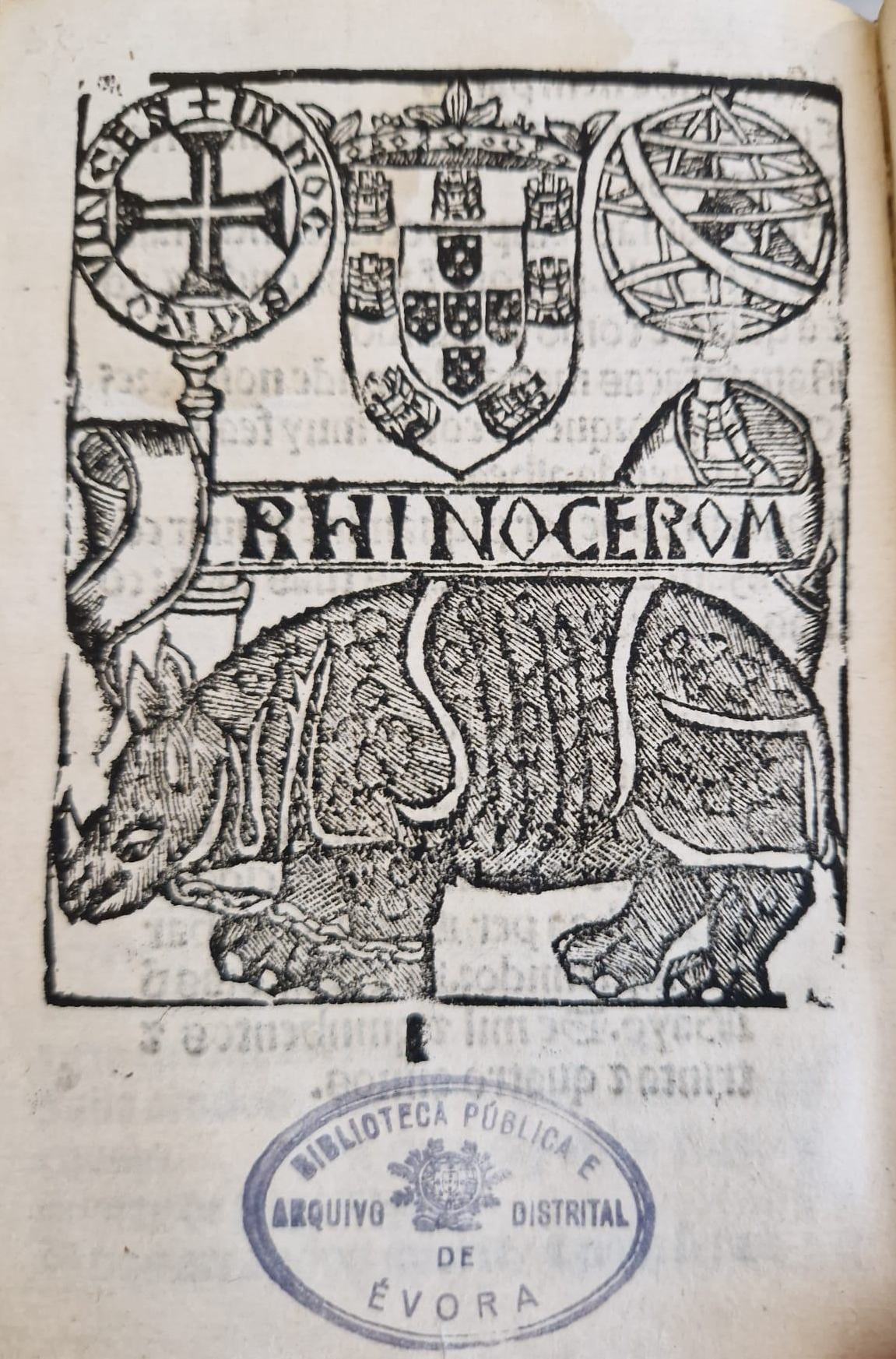 Rhinocerom. Illustration in a very rare booklet published in Portugal by the printer Germao Galharde. From: Ortiz, D.; Galharde, Germão 1534. Cartinha pera ensinar a leer. Lisboa, Germão Galharde. pp. 1-64 – 28 May 1534. 8vo. Unique copy in: Biblioteca Pública de Évora, Portugal (BPE): RES. 265-B (Cota antiga: G. E6 C2 nº 9).