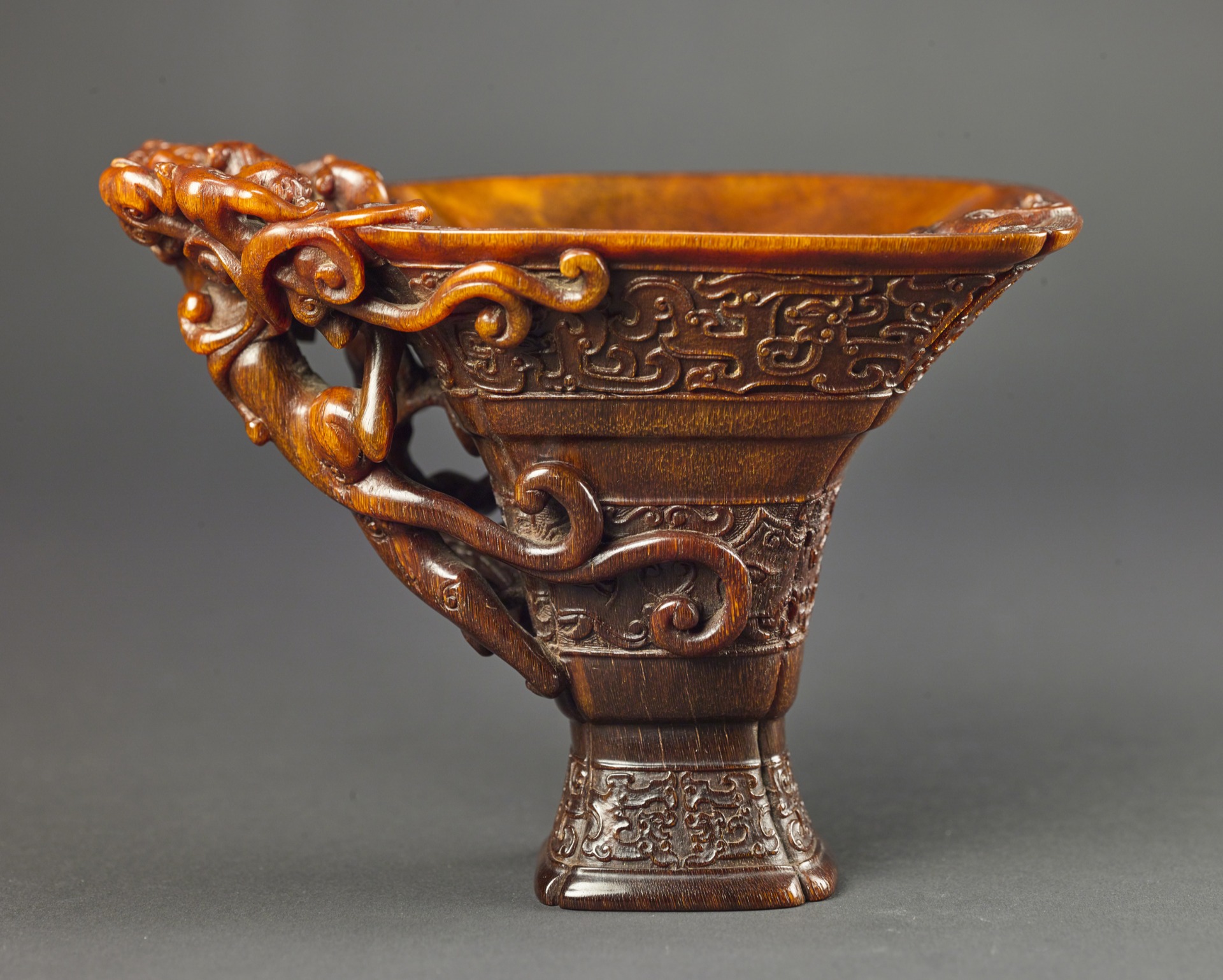 Rhinoceros Horn Cup with Archaistic Pattern and Chi-dragon Handle