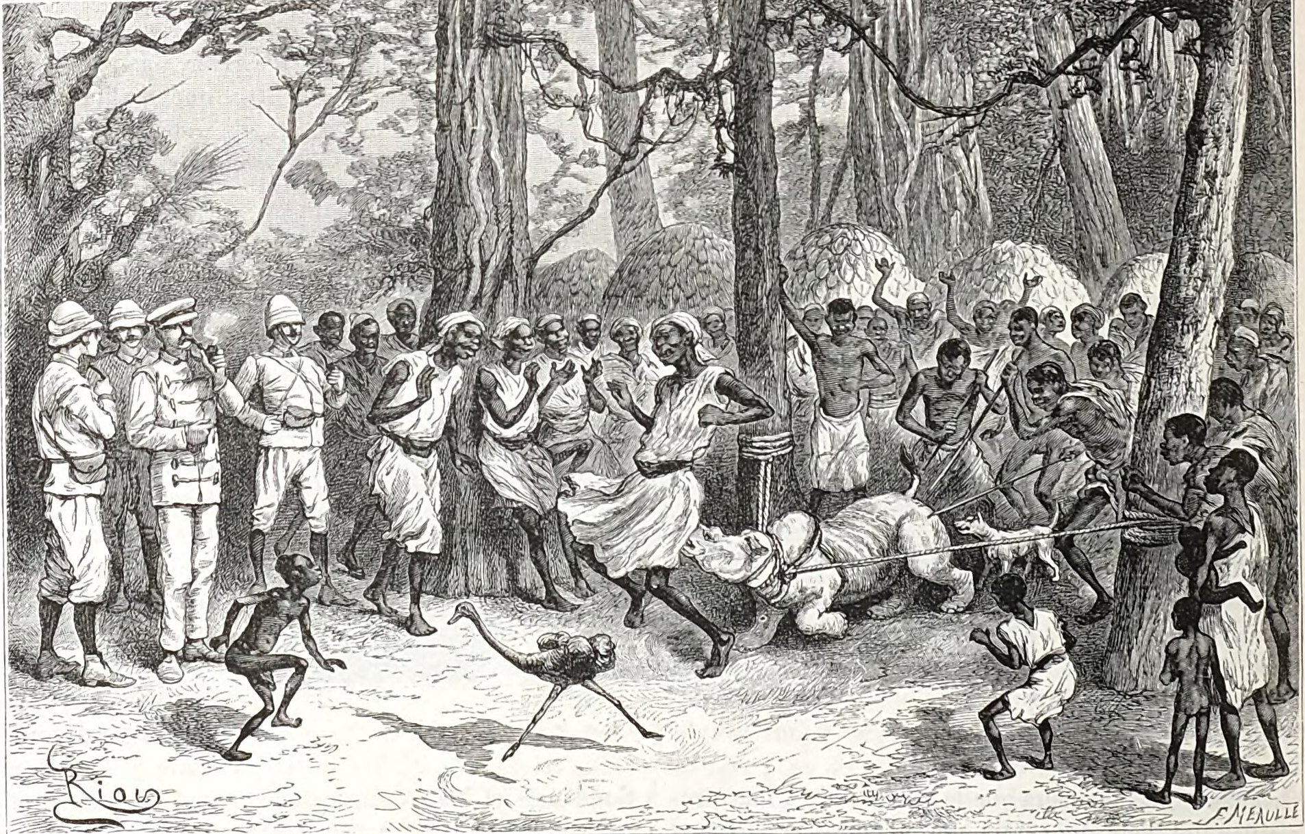 Le petit rhinoceros dans le camp. – Gravure tirée de l’edition anglaise.