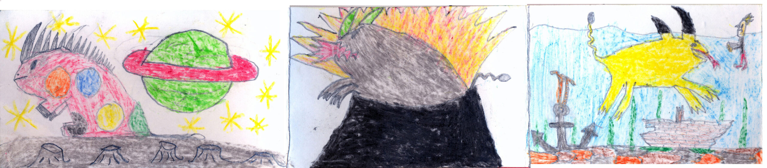 Drawings of three rhinoceroses: an extra-terrestrial one, a volcanic one, and an aquatic one by Kai Zivkovic (born in February 2000), a young rhino enthusiast in Rome, Italy. Drawings made in 2007 (image resolution: 400 dpi).