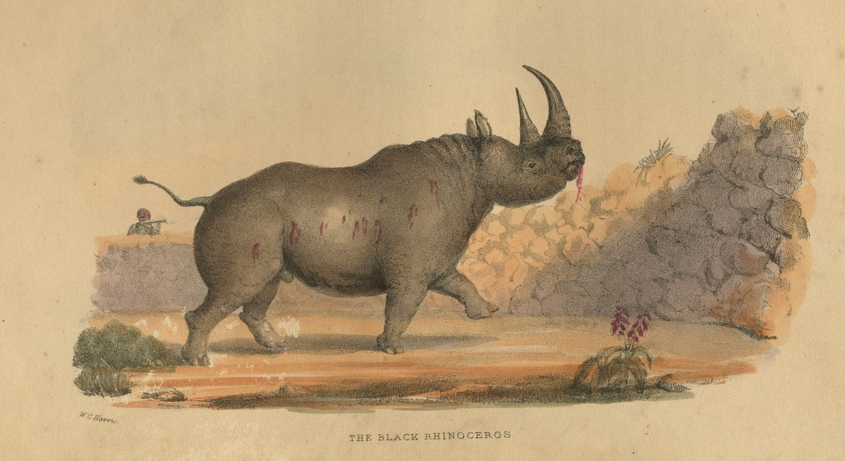 This hand colored litho of the Black rhino appeared in William Cornwallis Harris’ The wild sports of South Africa, John Murray/London 1839