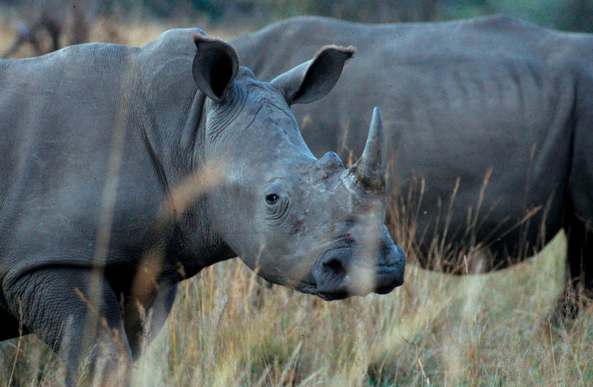 Southern White Rhino (Ceratotherium simum), close-up, at Lake Chivero Recreational Park, Norton, Zimbabwe, on 1997-06-06. Photo taken by Peter Dollinger, Zoo Office Berne.