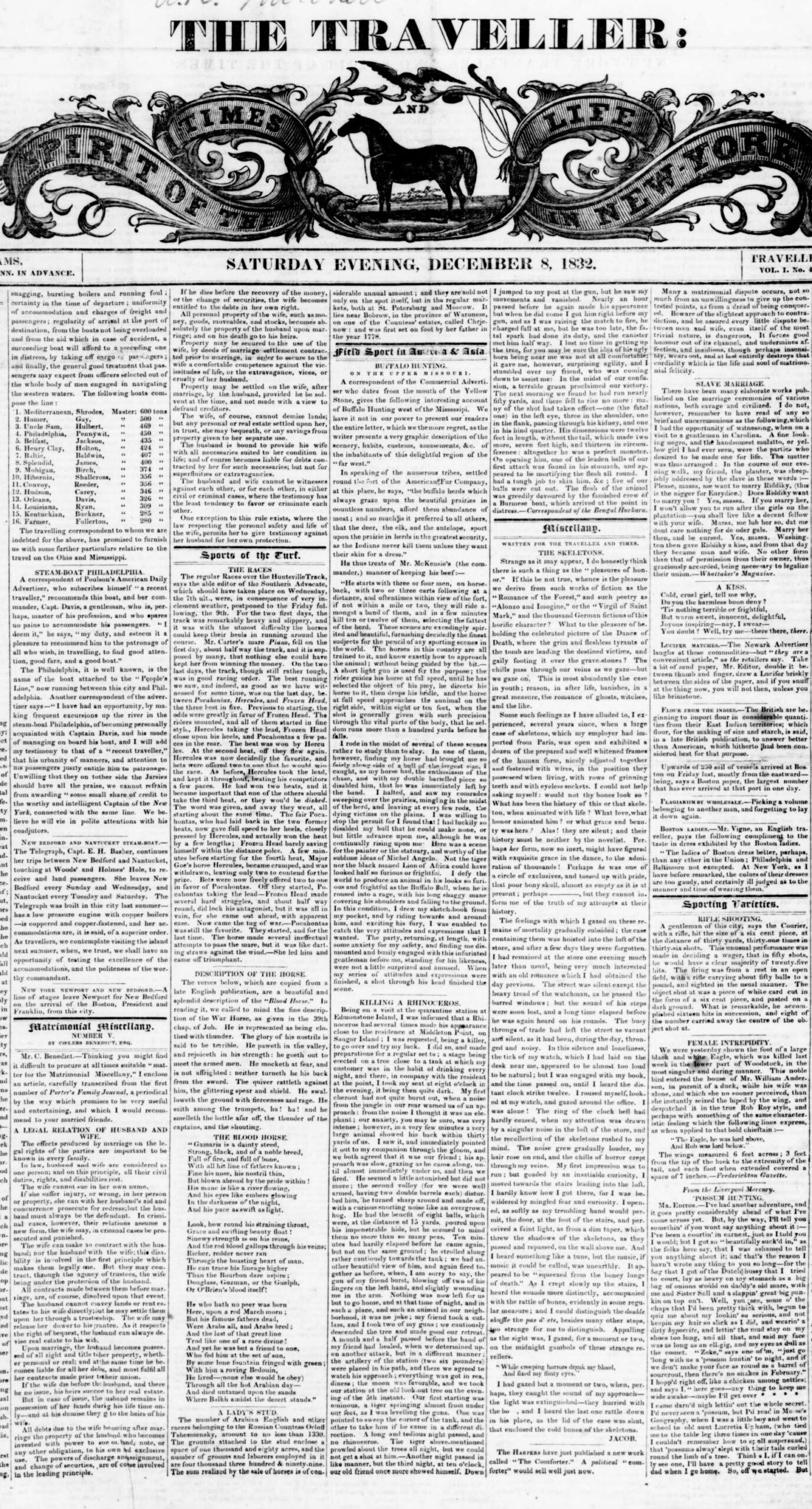 Shekarea, A. 1832. Killing a rhinoceros [Saugor Island]. New-York Traveller and Spirit of the Times 1, no. 51 (1832 December 8): 1.